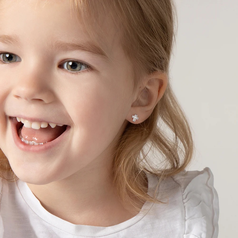 Sterling silver stud cross earrings for kids with cubic zirconia. Carefully designed earrings with secure screw clasps, children-friendly earring studs and finer screw threads. The backs are enclosed, thus protective from any irritation.