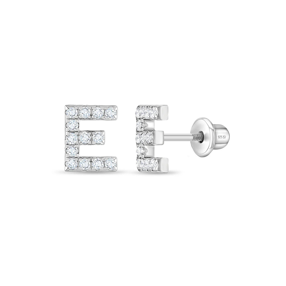 Sterling silver kids earrings with cubic zirconia – initial (letter) E. Carefully designed earrings with secure screw clasps, children-friendly earring studs and finer screw threads. The backs are enclosed, thus protective from any irritation.